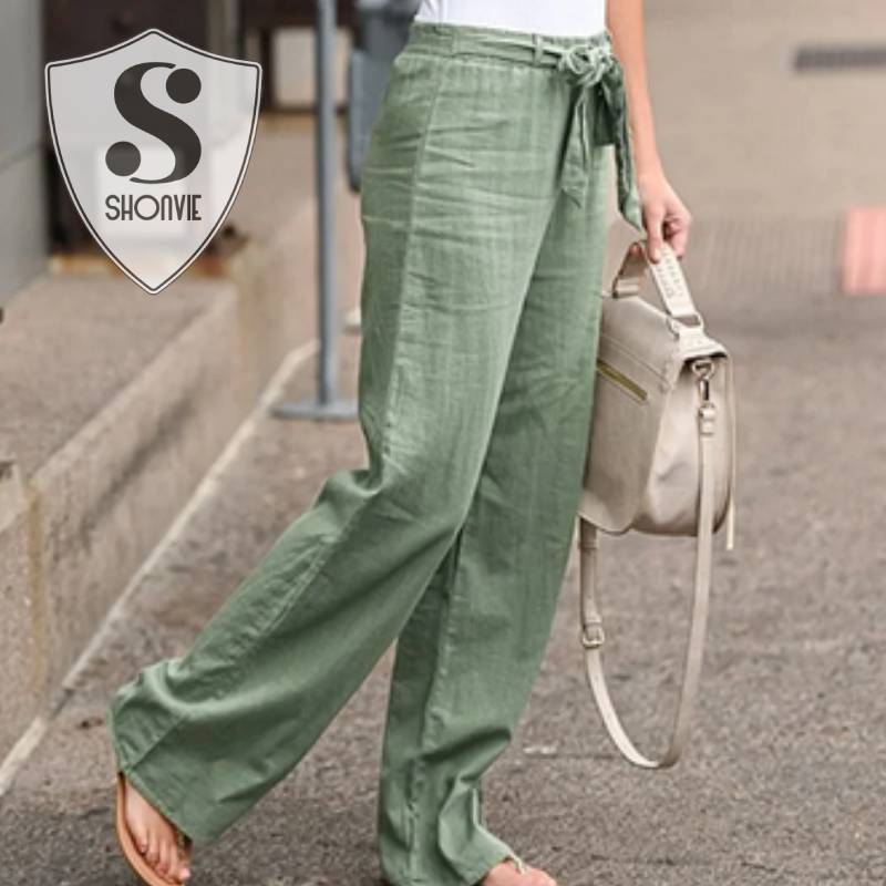 Women's spring lightweight pants, with casual style and straight cut. Perfect to wear high waisted and fitted with a belt. Made of soft and comfortable polyester and linen fabric, with a medium level of elasticity. Drawstring closure and ankle length. An ideal choice for spring and summer season.