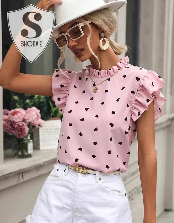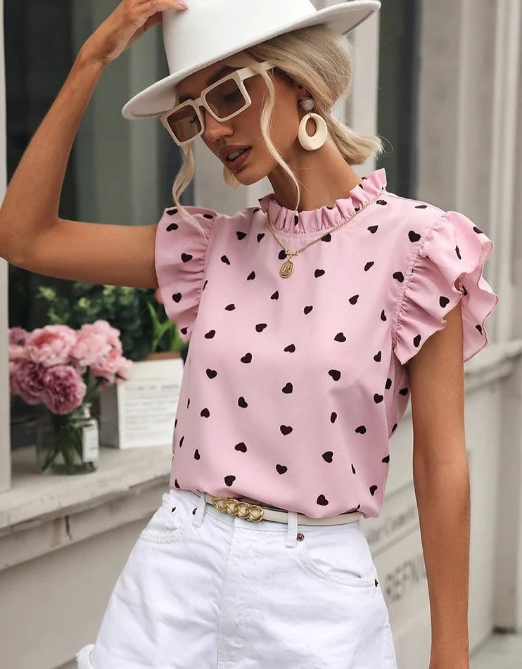 ¡Dale a tu estilo casual un toque de amor con esta blusa de corazones! Hecha de tela de chifón ligera y elástica, esta blusa presenta un cuello redondo y detalles de volantes para un look divertido y coqueto. Perfecta para el verano, ¡añádela a tu guardarropa ya!