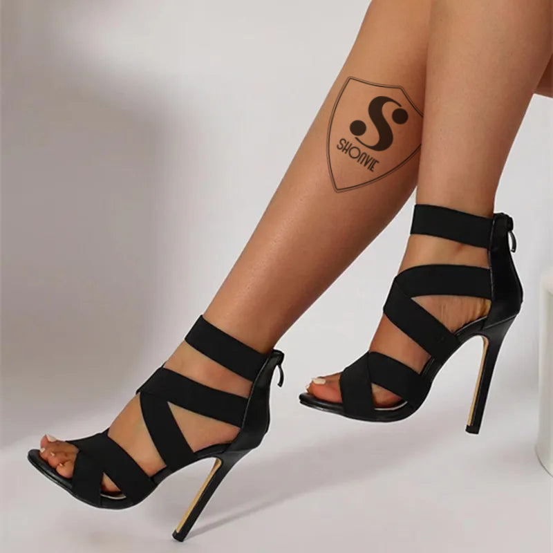 Eleva tu estilo nocturno con estos elegantes zapatos estilo gladiador. Con un tacón súper alto y sujeción de zip, estarás cómodo y segura durante tus fiestas. Disponibles en negro.