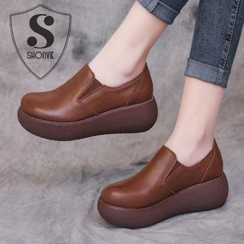 Plataforma de zapatos de mujer: zapatos casuales de cuero con cabeza redonda